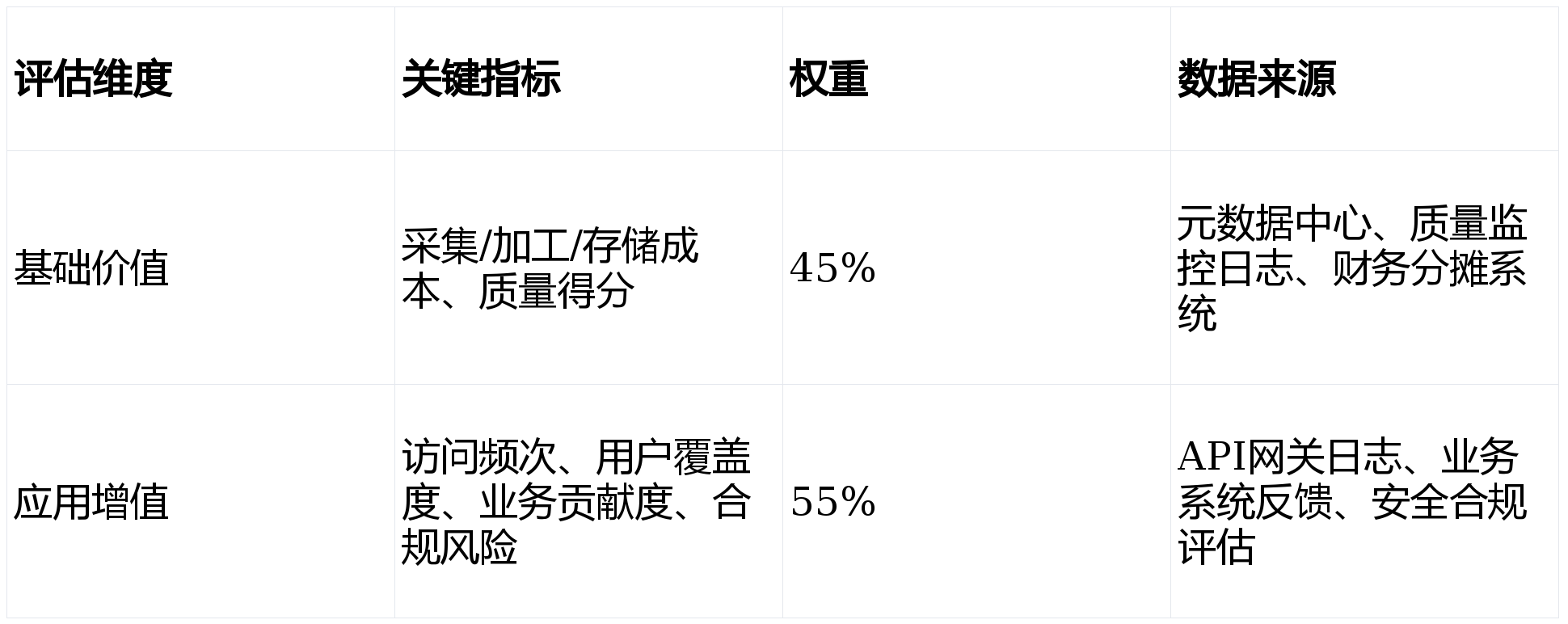 质量修正系数:根据GB/T 36344-2018标准,对数据的完整性、准确性、一致性、时效性等维度进行评分。质量得分作为价值评估的调节系数,高质量数据获得溢价,低质量数据进行折现。